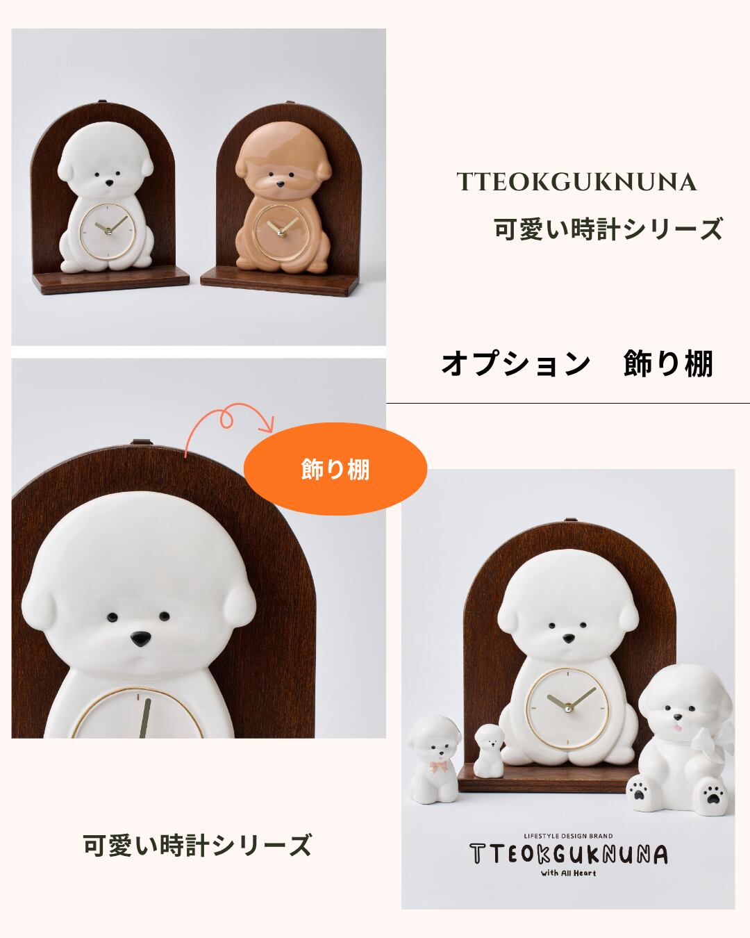 愛犬家の皆様にお届けするTTEOKGUKNUNAの時計シリーズが登場しました!セラミック製で、ハンドメイドのため、ひとつひとつに愛情が込められています。ポメラニアン、ビション、プードルのかわいいデザインが特徴で、 colorも豊富になりました。